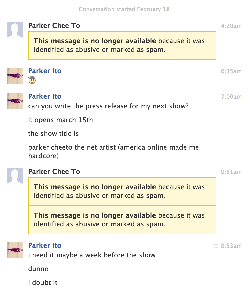 Parker Ito is a net artist. Parker Ito is an Internet artist. Parker Ito is a post-internet artist. Thus speaks Parker Ito himself. Parker Ito does not defy categorization. He loves categories and he loves to apply them to himself. This is why he is hard to pin down. The labels stick to him just as they peel off. Or maybe they simply cover each other archeologically like posters on a billboard. Maybe this is why people call him nicknames instead. Parker Ito loves that, too. When people call him nicknames, he adopts them. Therefore, Parker Ito is not simply a net artist, an Internet artist, a post-internet artist. Parker Ito is no longer simply Parker Ito. Parker Ito thus reappears as Parker Burrito. Parker Ito exhibits as Parker Cheeto. Parker Ito works in the name of Deke2 and Olivia Calix. Parker Ito tweets in the name of Parker’s Poetry LOL: “If I wasn’t me… I wouldn’t be me.”