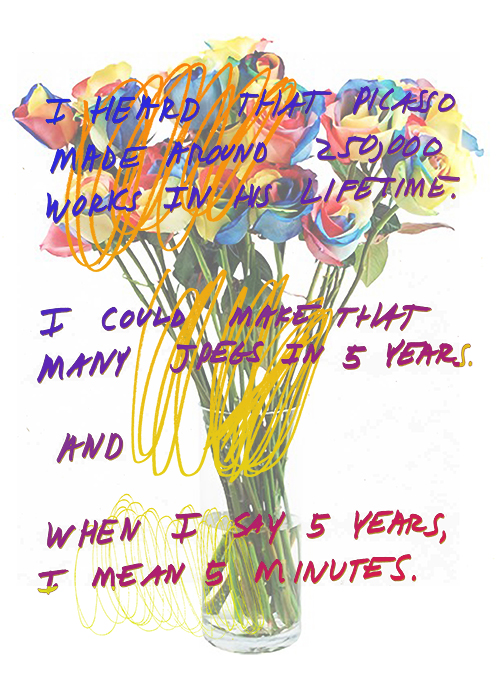 Often in Parker Ito’s works the artist juxtaposes two things – two things, which might have been opposites earlier on, but are becoming more and more similar. It could be the real and the virtual. Or photography and painting. It could also be Parker Ito’s incessant use of the language of abstract painting juxtaposed with or enmeshed in flowers. The latter is even where all the above comes together for Parker Ito. On the one hand we have flowers in the still life tradition from Spain and the Netherlands in the 17th century, which equals hyperrealism, today redubbed photorealism. On the other hand, abstraction, which in the 19th and 20th century grew out of a negation of figuration, of a realist representation of reality. Parker Ito walks in the tracks laid out by these two traditions and then again he is the heir to neither. Or rather, he is the heir to Edouard Manet, who in the words of Georges Bataille treated still life as “a pretext for the act of painting.” Nowhere is this idea more convincing that in the syphilis-ridden and partly immobilized Impressionist’s last paintings, a large bulk of which where mere flower paintings. If he was by then still a painter of modern life, modern life was by then but a composition of colors. Later, in the 1950s Clement Greenberg would trace modernist painting back to this man for whom painting was nothing but paint. But Parker Ito can also be backtracked to this sort of painting where paint is not simply painting but modern life. The flower Parker Ito likes the most is a flower, which is in itself like a bouquet, a composition of different colors. It is the rainbow rose, whose stalk is split in order to draw up different colors. It is a flower that is split to become one, just like Parker Ito is made up of Parker Ito, Cheeto, Burrito, Oilvia, Deke2, and so on. In this rose the painter, the painted and the painting become one. It is thus a flower which does not look more or less unreal when Parker Ito exhibits it as such, reworks it in Photoshop, with the gradient function, screen prints it onto reflector fabric, rephotographs it and leaves it circulating on the Internet. It is a flower, which does not only blossom one time, but continues to blossom – whose process of dematrialization is accelerated by being split just as its process of rematerializations. If the flower is an abstract painting, it is not because it can be reduced to pure paint. It is rather abstract because it cannot be reduced to one thing. And this is probably why it makes sense that Parker Ito has written in a press release that he doesn’t “believe in pronouncing GIF the right way,” nor ”in wearing all black”, nor “in press releases” – but rather “me… The Internet and me.”